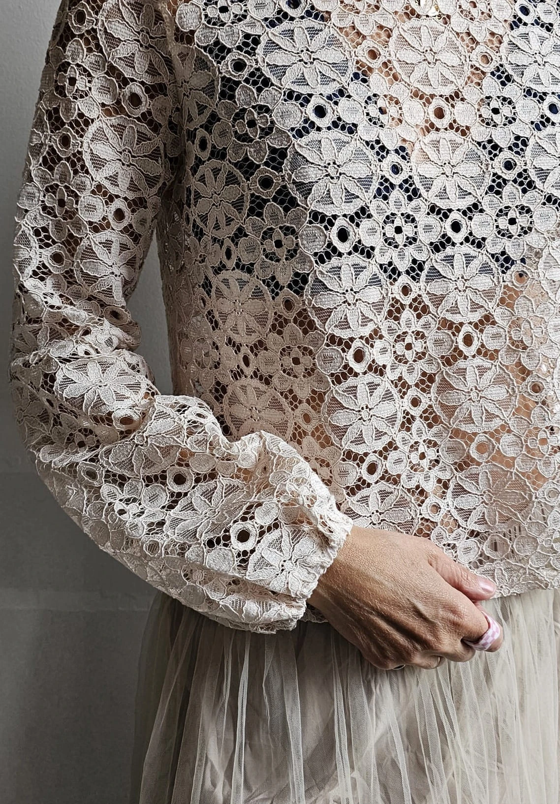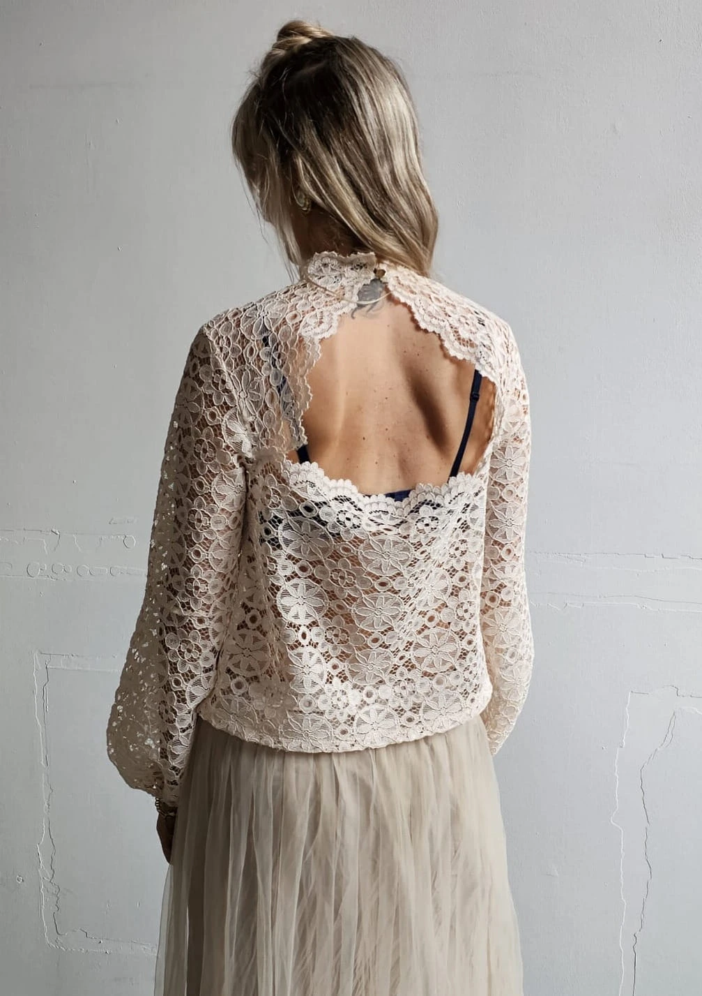 Bluzka wykonana z gipiury o luźniejszym kroju. Posiada odkryte plecy, zapinana na plecach na guzik, przy rękawach gumki.
