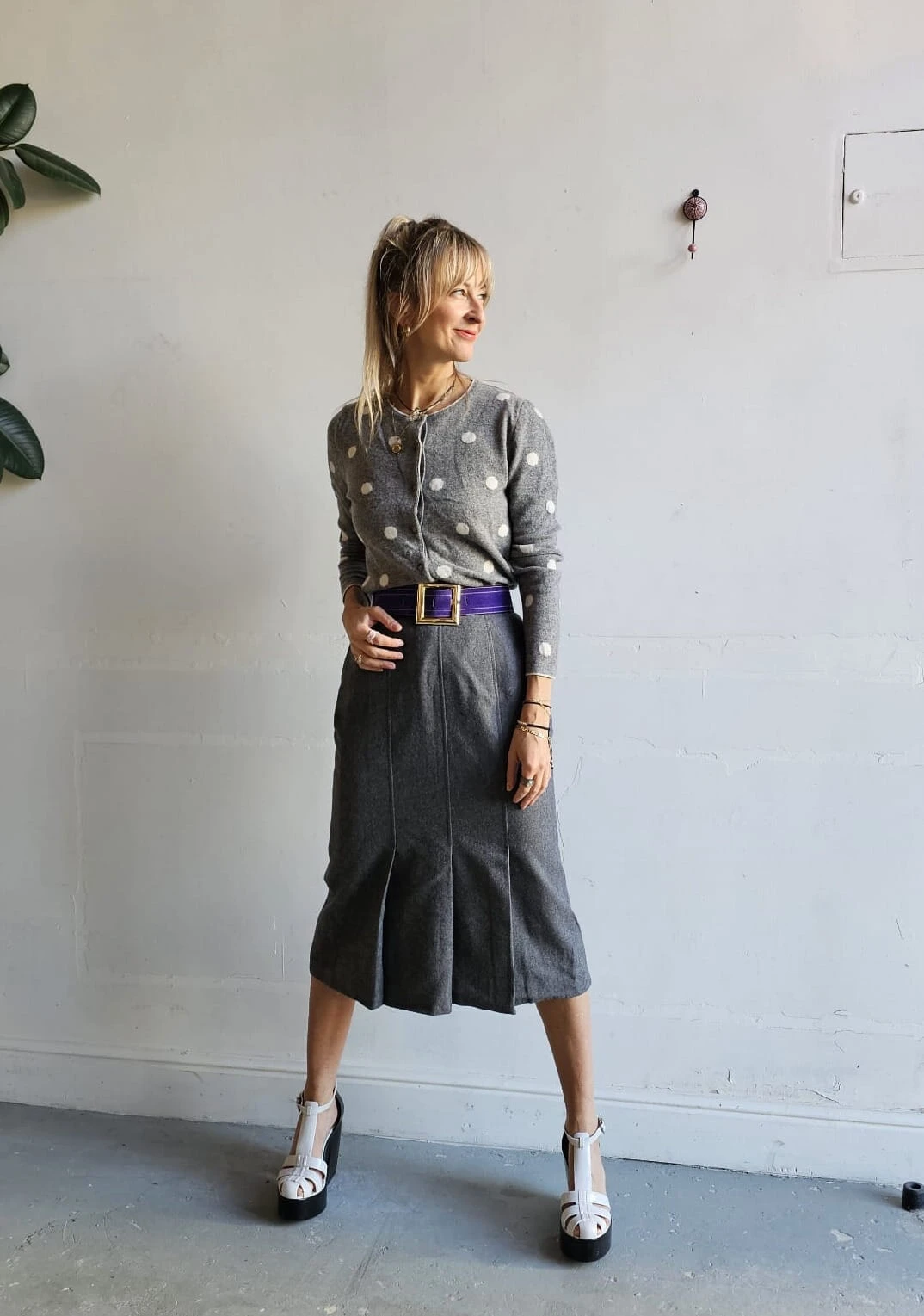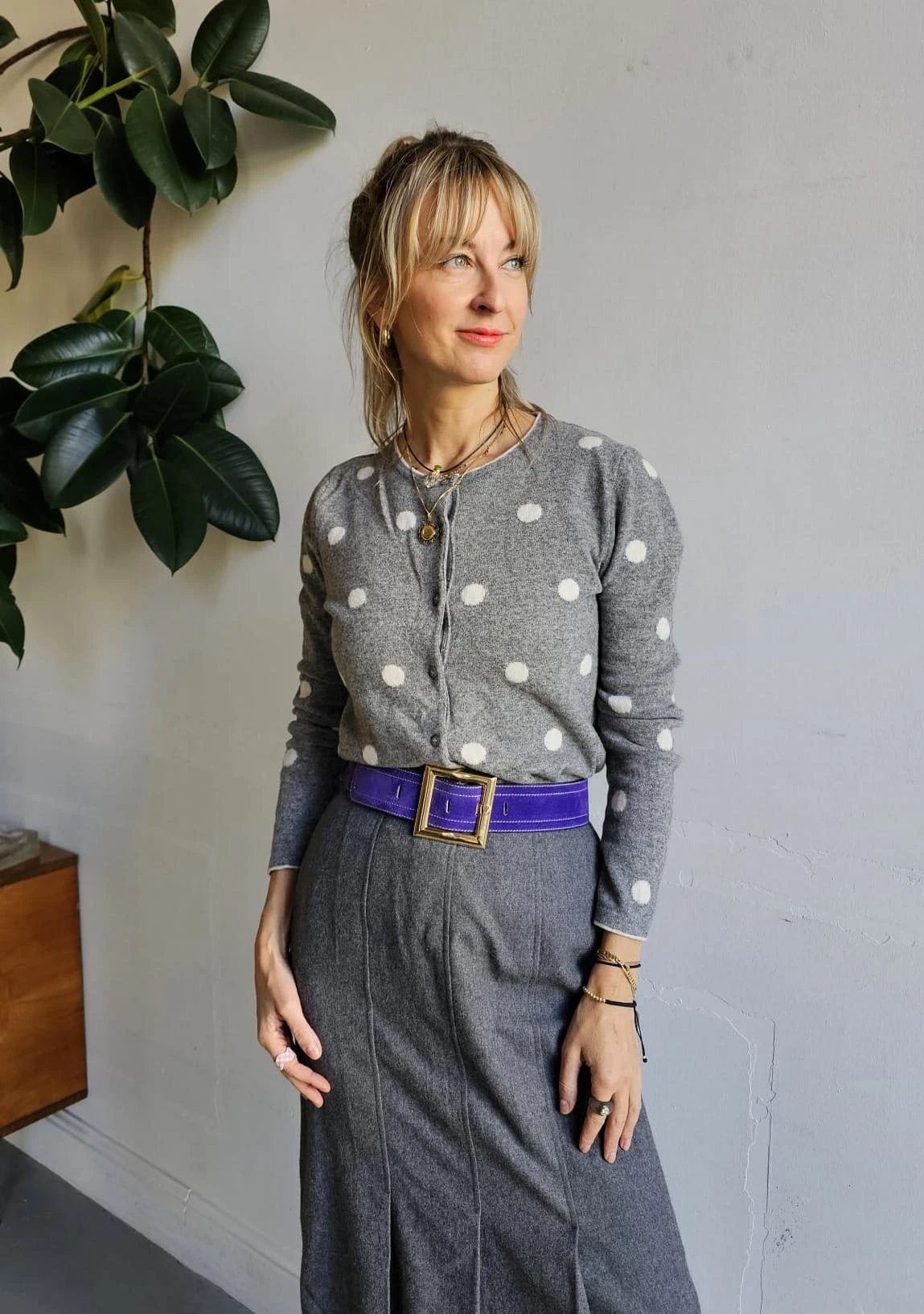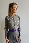 Szary kardigan w groszki — klasyka w nowoczesnym wydaniu. Miękka wełna układa się lekko, tworząc idealną bazę dla nonszalanckich stylizacji.