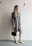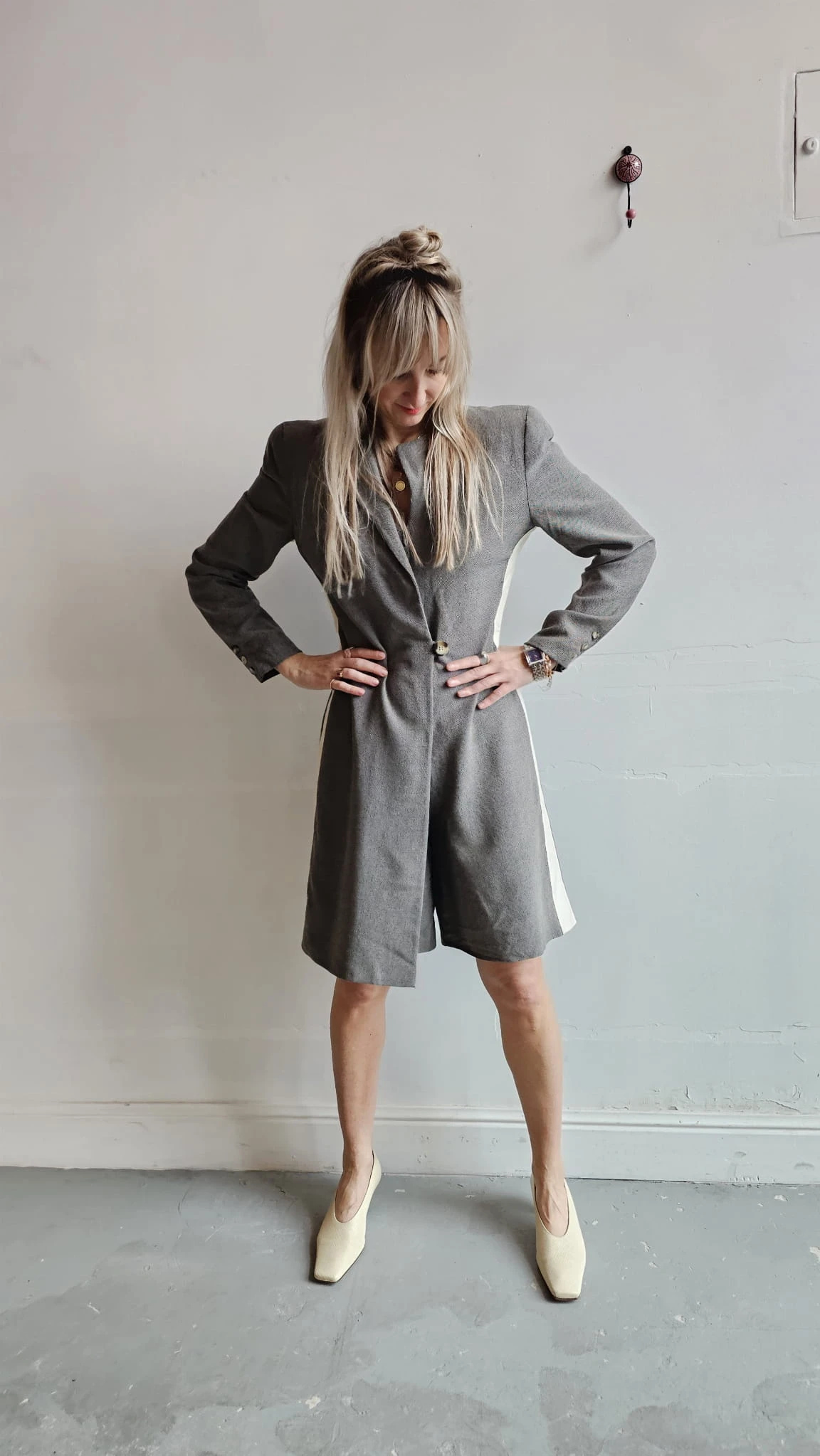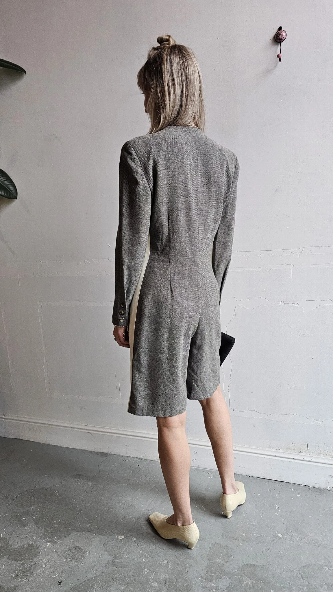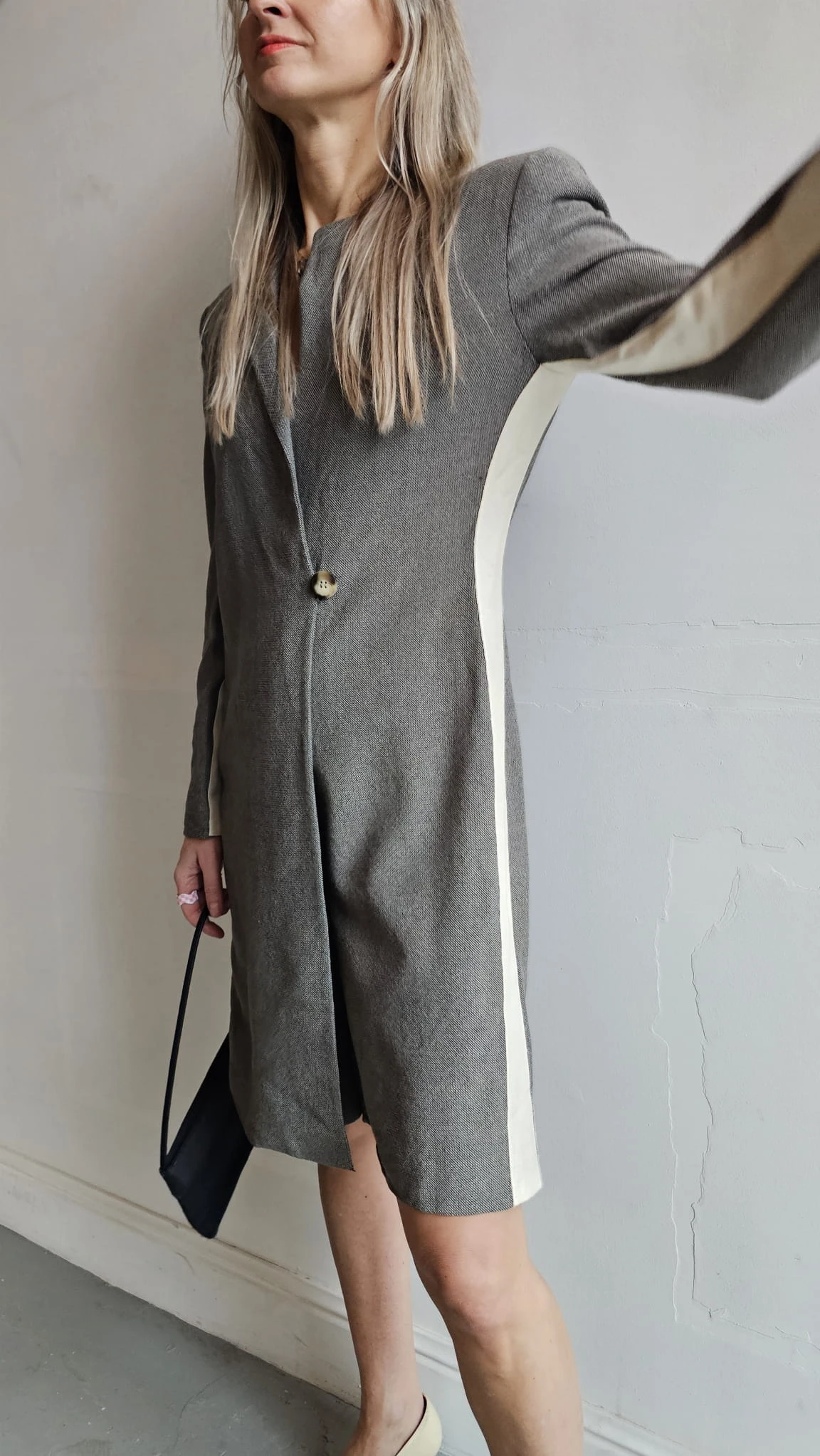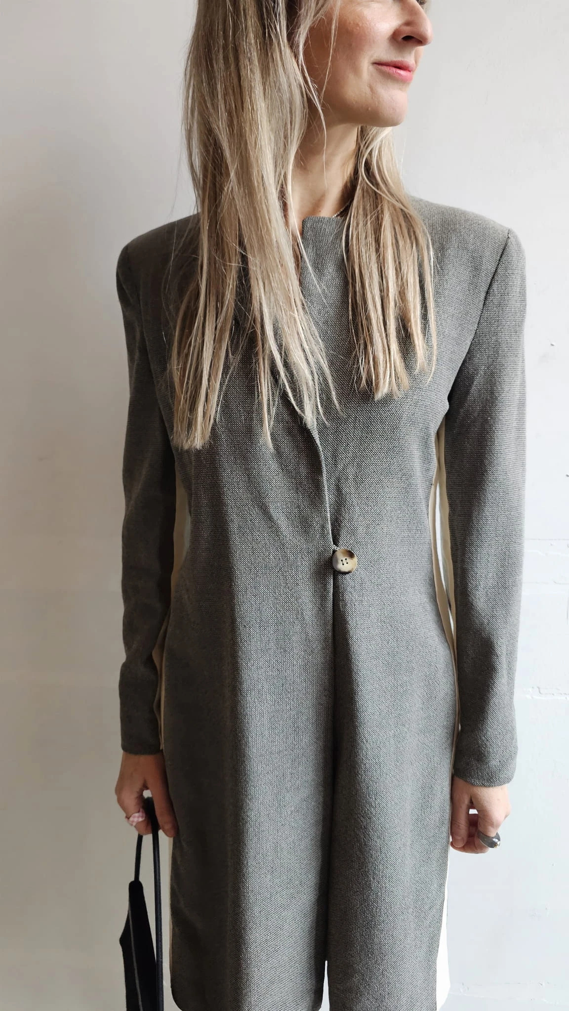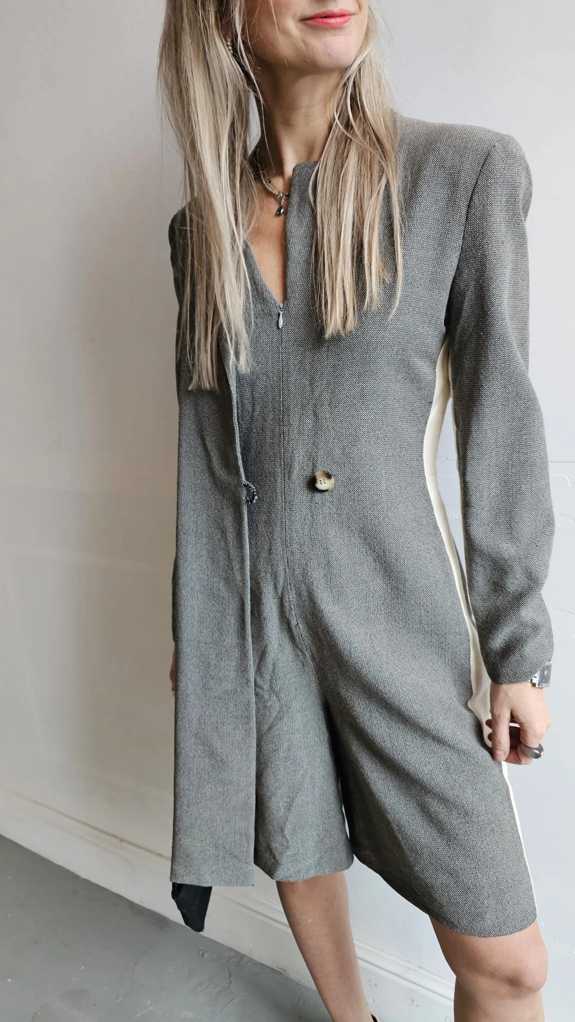 Kombinezon Giorgio Armani w klasycznym, szarym odcieniu zachwyca minimalistyczną formą i perfekcyjnym krojem. Strukturalny, wełniany materiał pięknie trzyma linię, podkreślając sylwetkę w subtelny, niewymuszony sposób. Ramiona profilowane delikatnymi poduszkami. Zapinany na suwak oraz guzik. Ponadczasowa elegancja w stylu power dressing — idealny na dzień i wieczór.