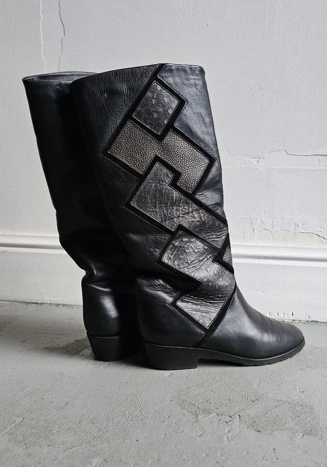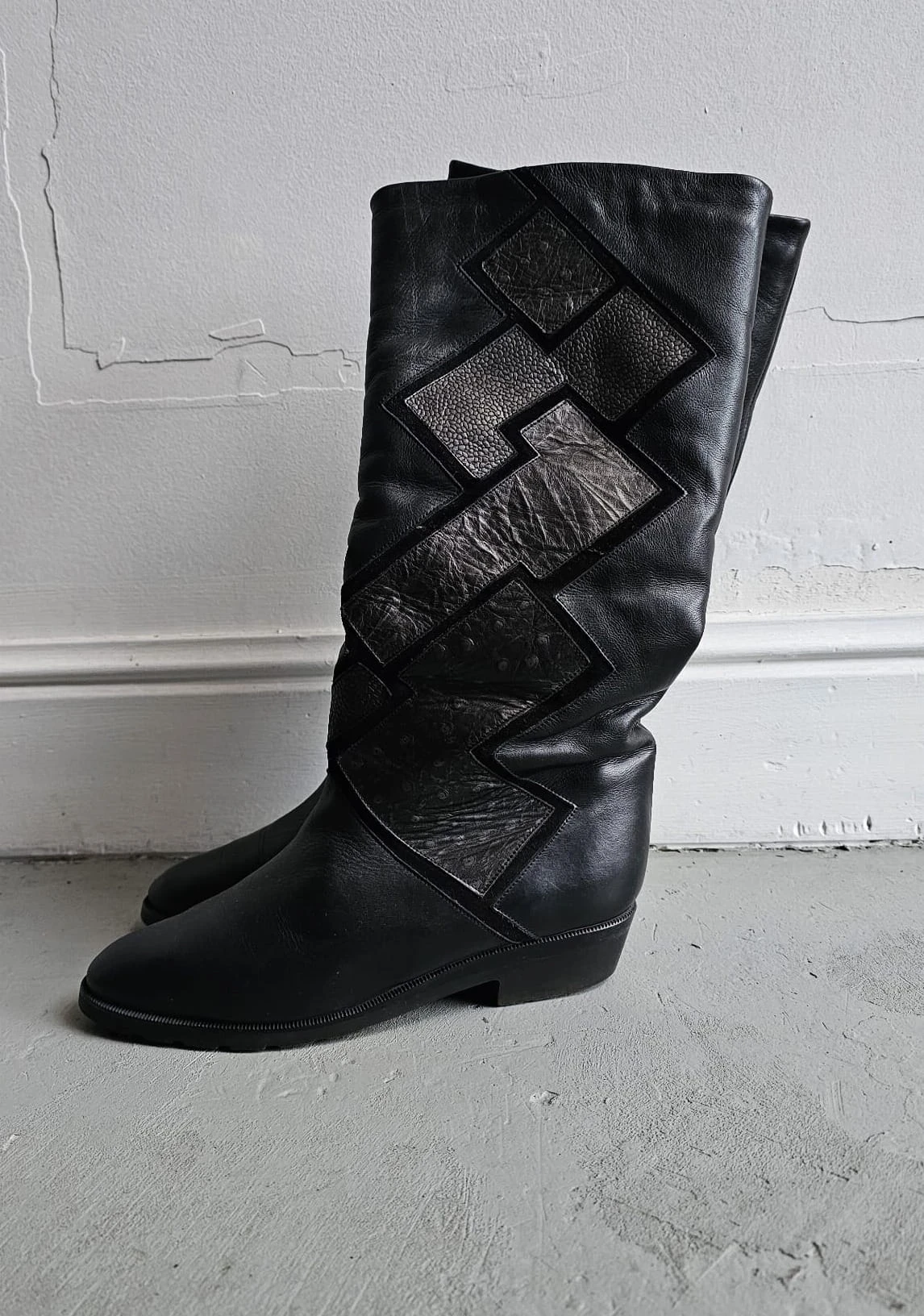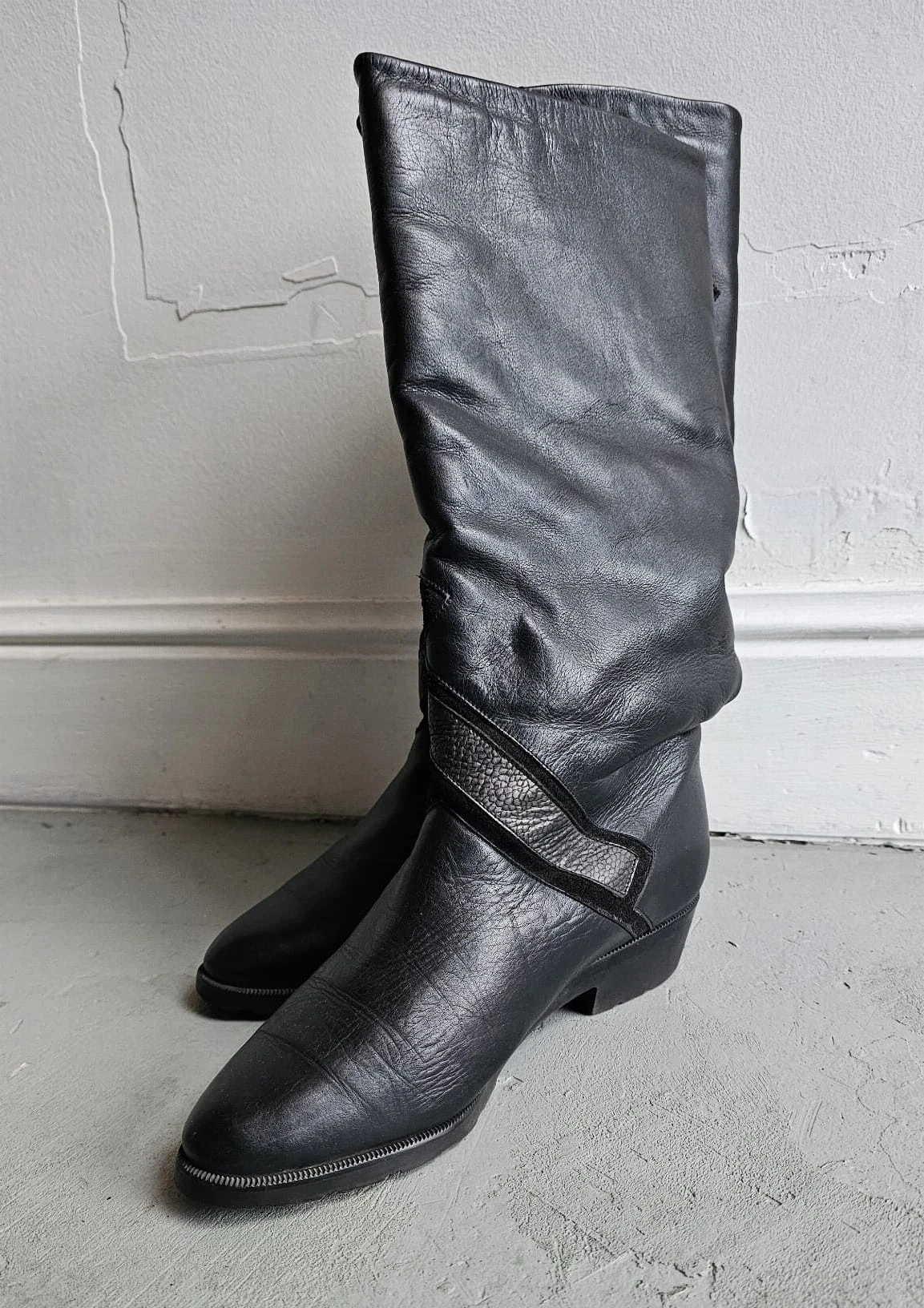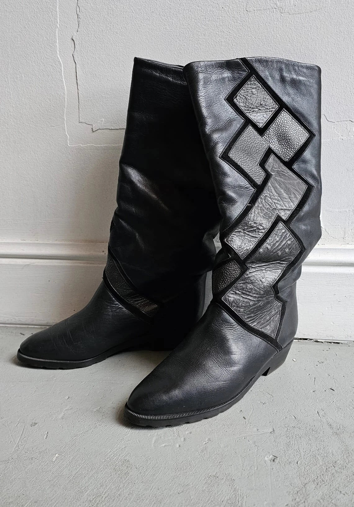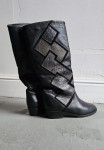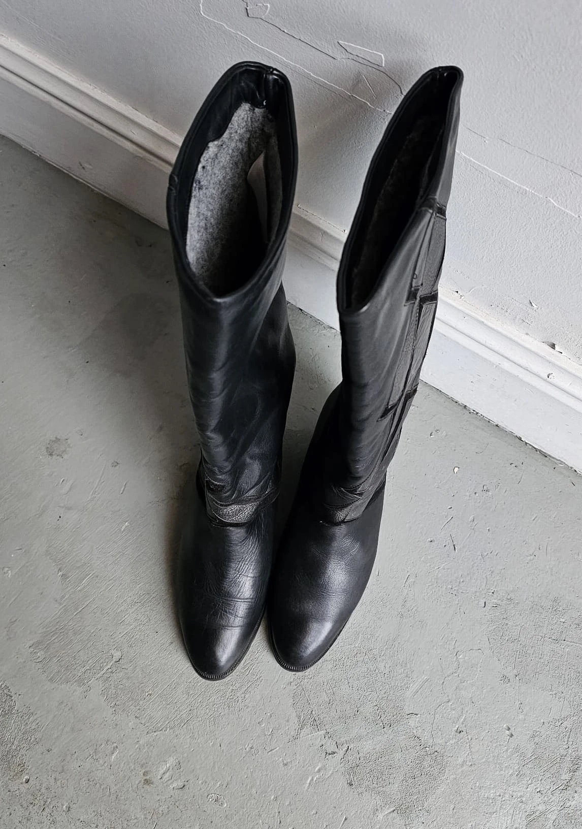 Skórzane, ocieplane kozaki vintage na kauczukowej podeszwie i niewielkim obcasie. W środku ocieplenie z futra. Bardzo wygodne. Świetne do spódnic, do szerokich spodnie o krótszym kroju.