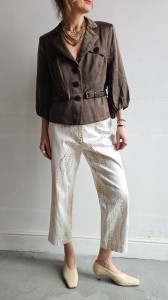 Lekkie spodnie Betty Barclay vintage w białym odcieniu z subtelnym, organicznym wzorem w kolorze złota. Prosty, lekko skrócony krój pięknie układa się na sylwetce i daje swobodę noszenia. Idealne do letnich stylizacji w duchu effortless i modern vintage.