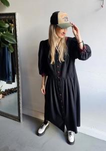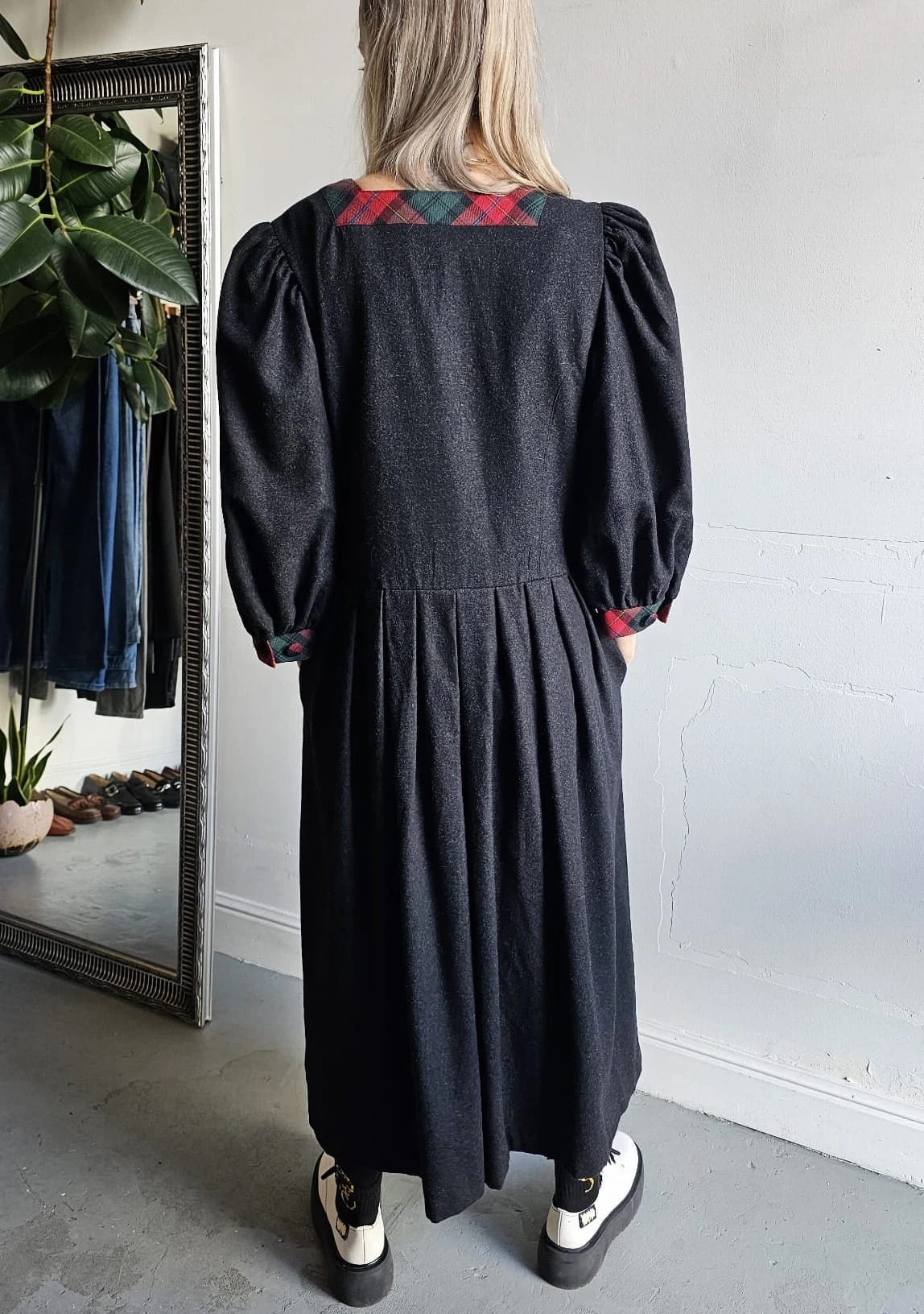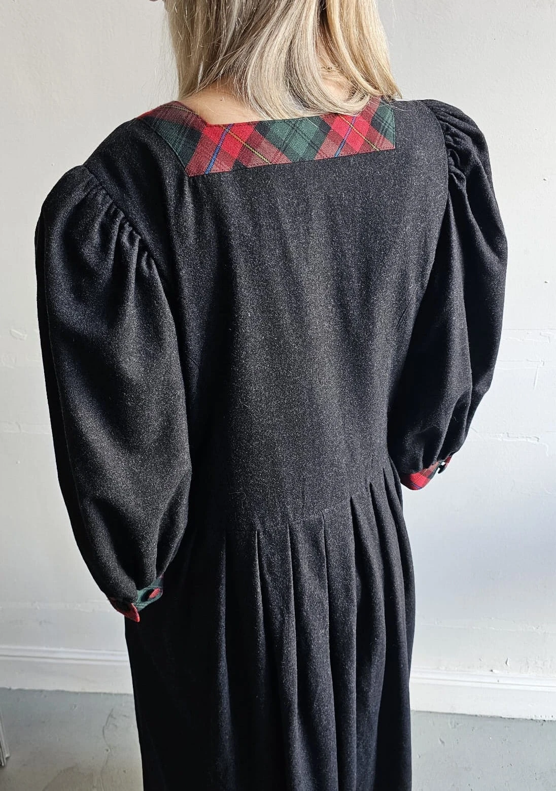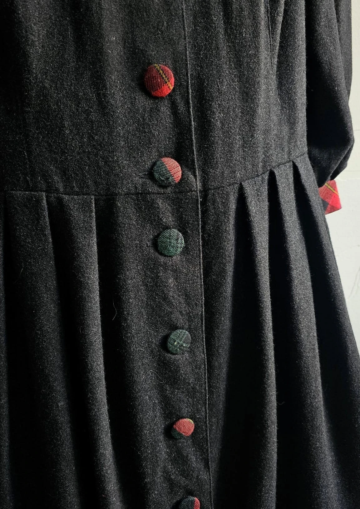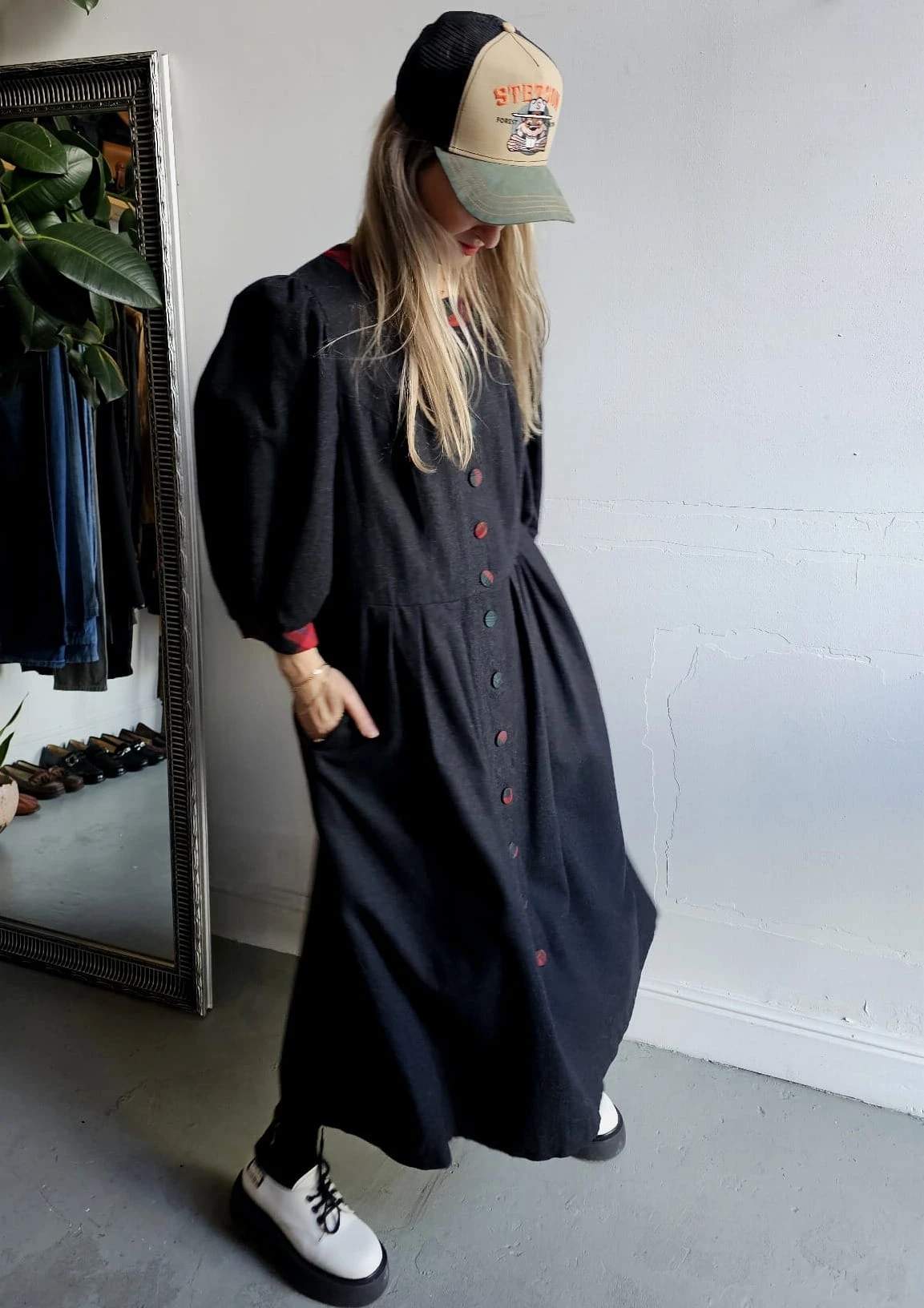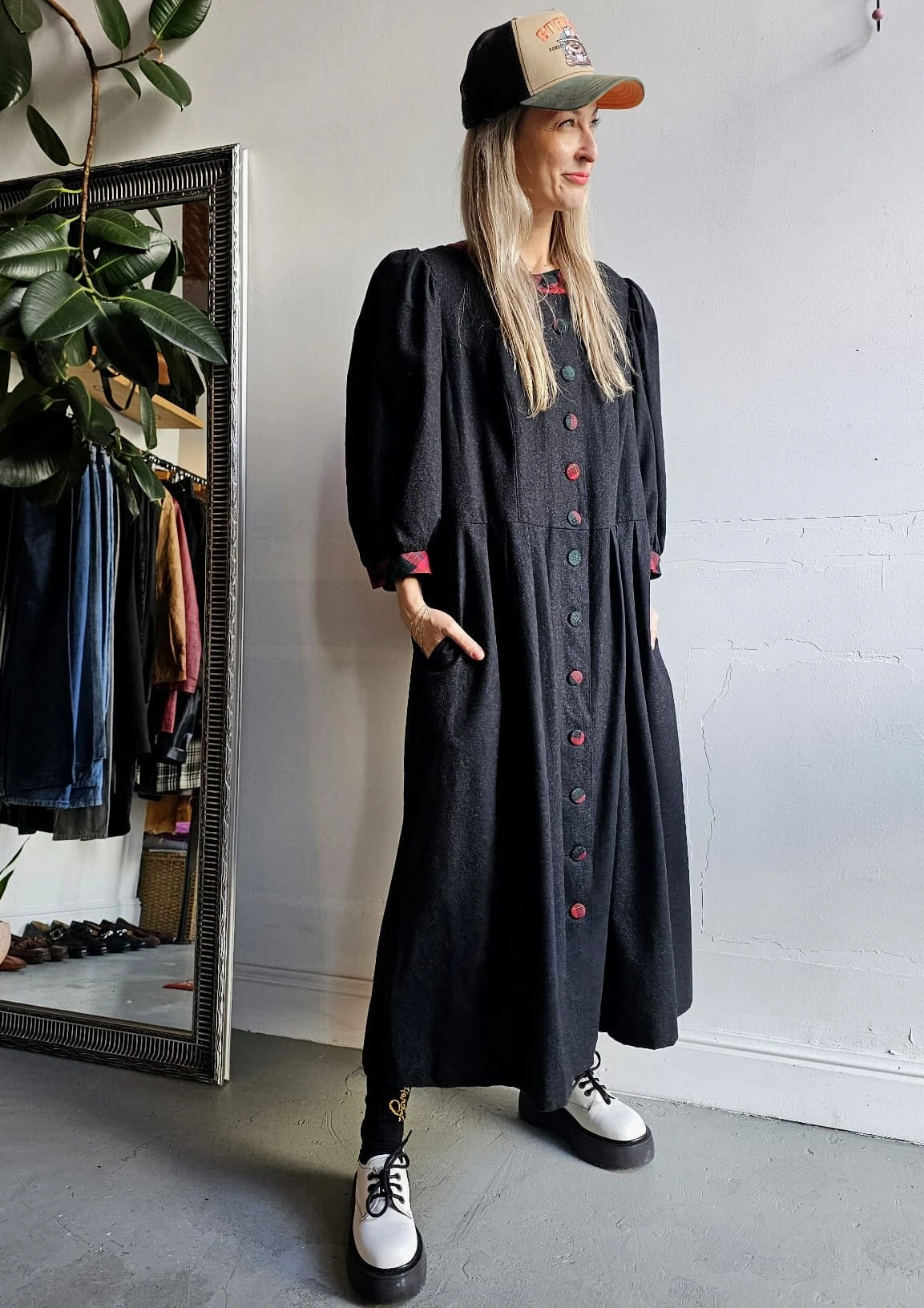 Wełniana suknia oversize zapinana na duże, ozdobne guziki.
