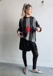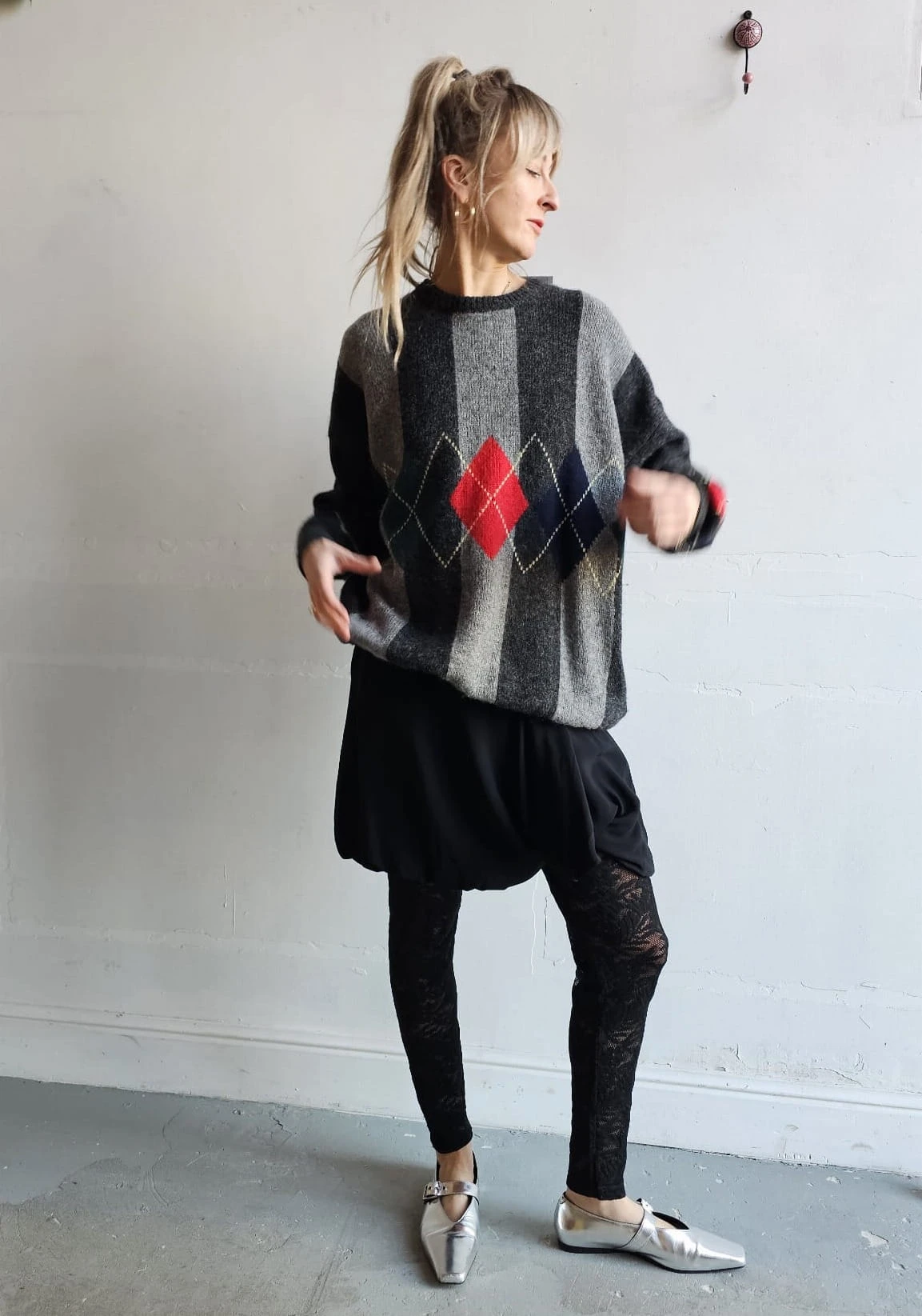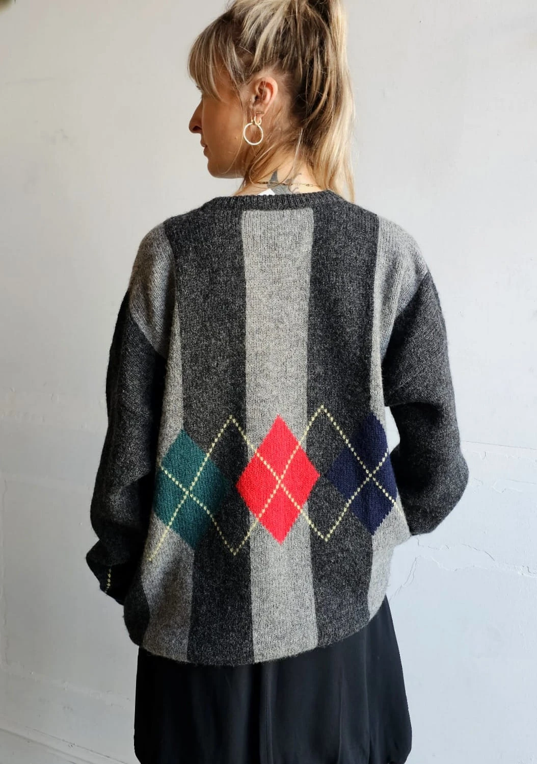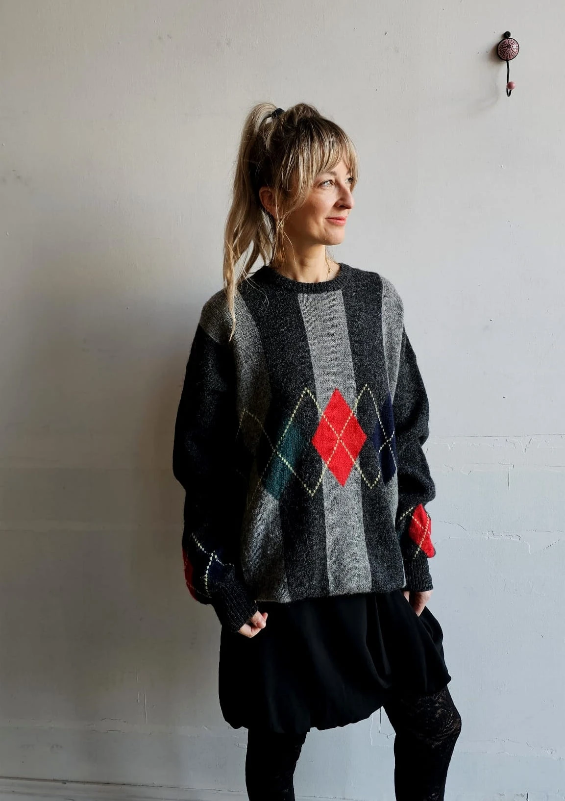 Sweter w klasyczny wzór argyle w odcieniach szarości, grafitu i czerni, z wyrazistym akcentem czerwonego rombu. Wełniana dzianina i lekko oversize’owy krój nadają mu swobodny, unisexowy charakter. Ponadczasowy vintage, który świetnie przełamuje kobiece stylizacje i doskonale sprawdzi się także w bardziej minimalistycznych zestawach.