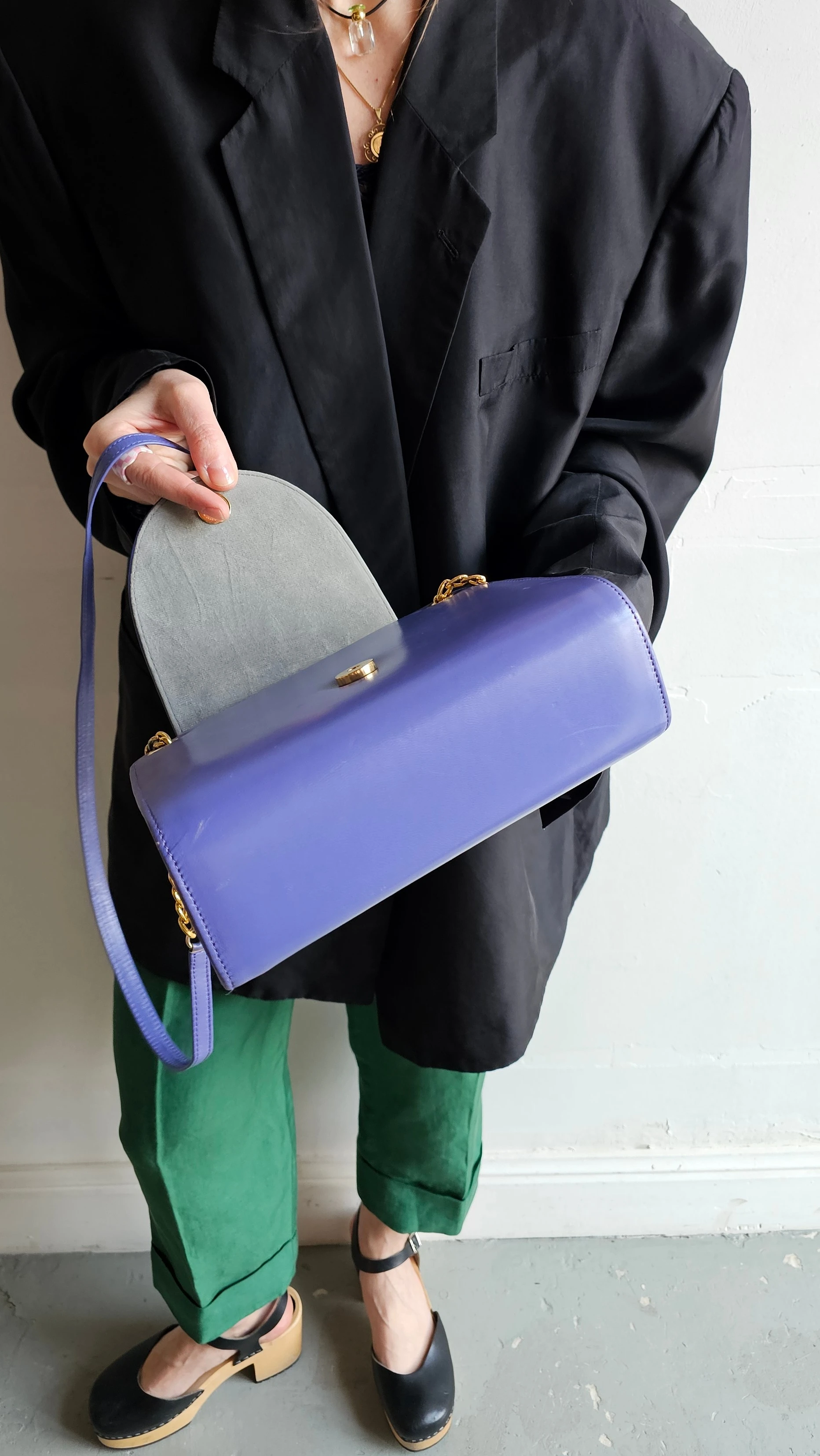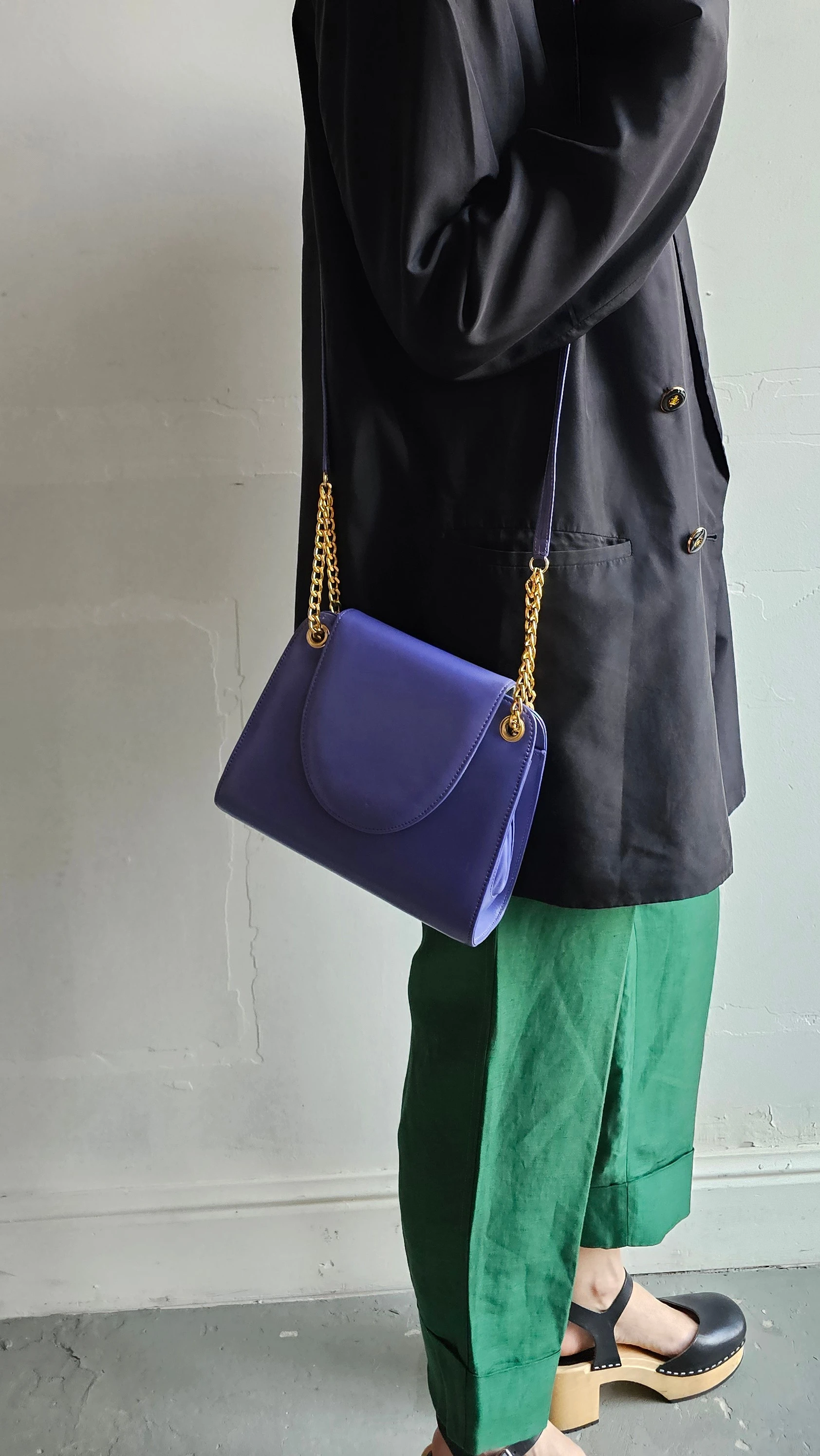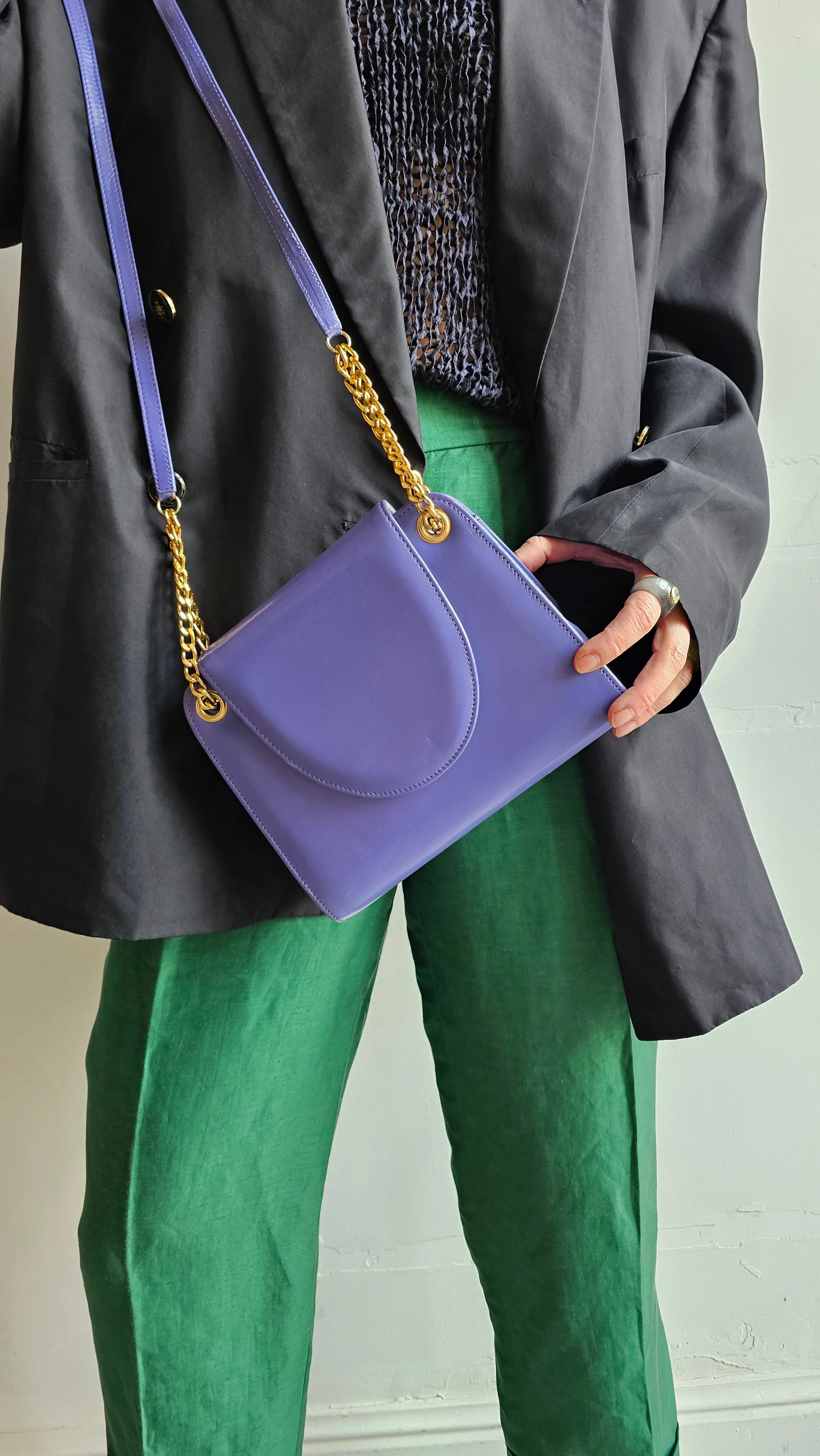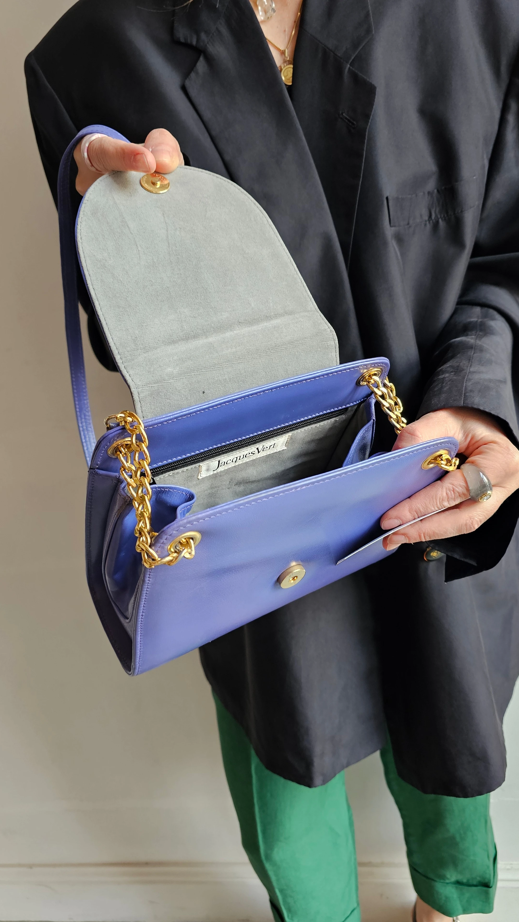 Skórzana torebka Jacques Vert w wyrazistym, fioletowym odcieniu z eleganckim złotym łańcuszkiem. Klasyczna forma przełamana kolorem tworzy mocny, ale wciąż ponadczasowy akcent. Idealna do stylizacji, które potrzebują jednego wyraźnego elementu.